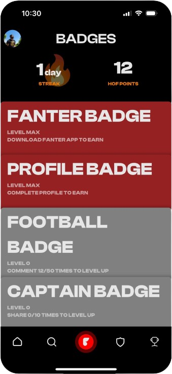 Chat with Fanter to unlock exclusive badges. Level them up from Rookie to Hall of Famer.
